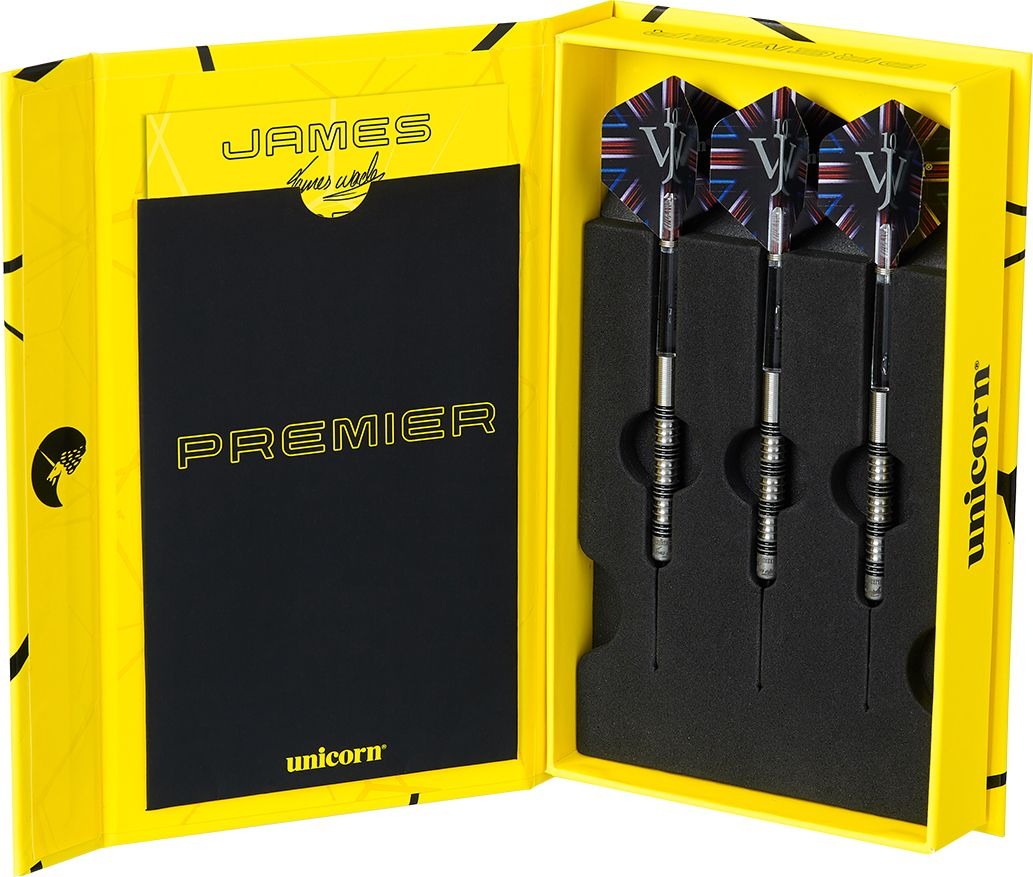 Deze mooie Unicorn Premier 90% James Wade dartpijl heeft een straight model barrel met Ringed grip waardoor deze dart een goede houvast heeft.